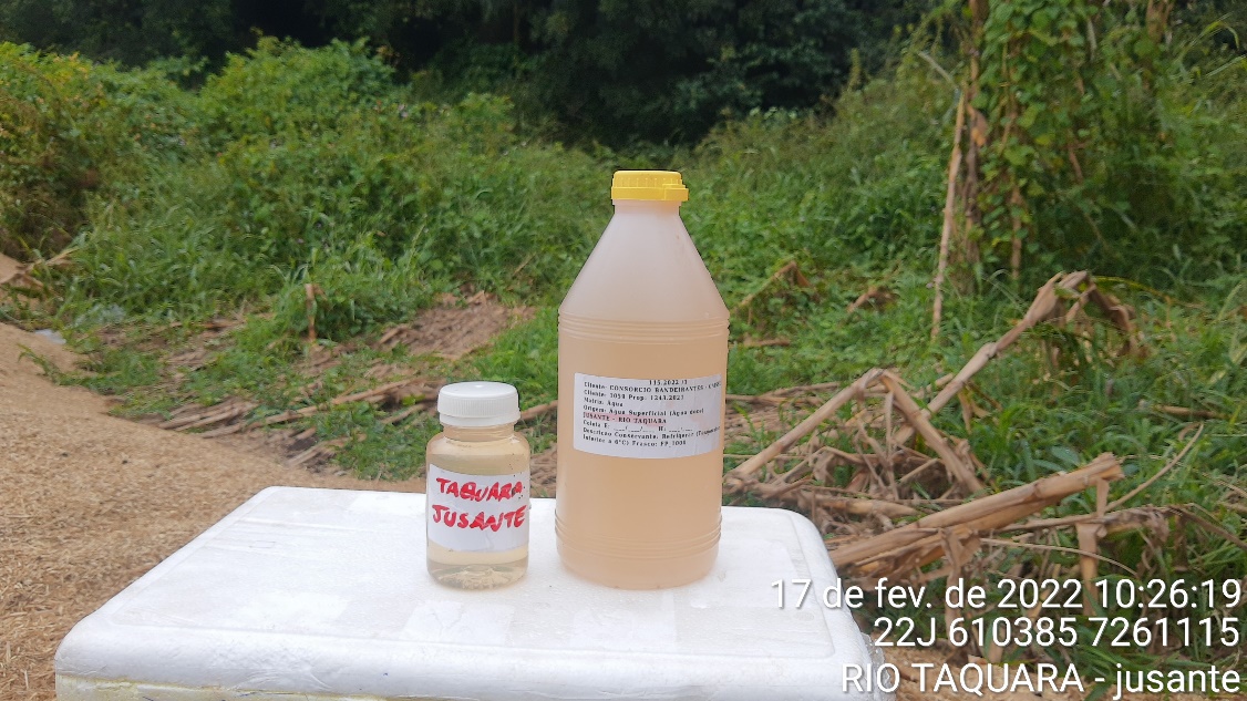 Frascos com águas do Rio Taquara, ponto a Jusante.